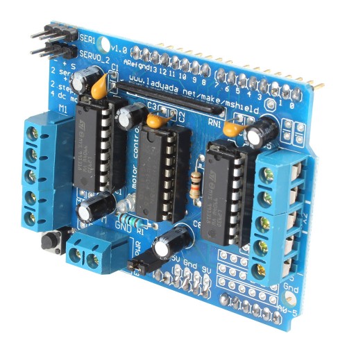 Arduino motor sürücü shieldi, Arduino üzerine takılarak 4 DC motoru veya 2 step motoru (unipolar veya bipolar) ve de en az 2 servo motoru kontrol etmenize imkan sağlayan bir karttır. Kart üzerinde 2 adet L293D motor sürücü entegresi mevcuttur. Bu entegreler içerisinde toplam 4 adet H köprüsü bulunur. Her bir köprü üzerinden 0,6A akım akmasına imkan vermektedir(Anlık 1,2A). Kart tümüyle lehimli olarak gönderilmektedir