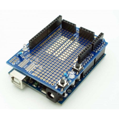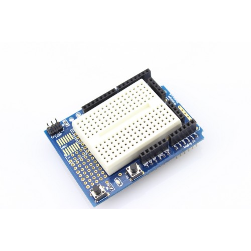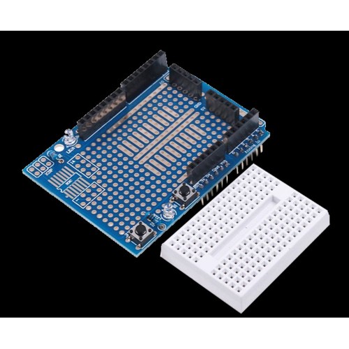 Arduino UNO R3 Proto Shield, Arduino projelerinizi breadboard üzerinden düzgün bir devre haline getirmede ve özel olarak tasarlamış olduğunuz devrelerin Arduino ile beraber kullanılmasına imkan sağlamaktadır. Arduino UNO R3 modeli için tasarlanmıştır ve benzer pin yapısına sahip olan Leonardo veya farklı kartlarla beraber de kullanılabilir. Kit dahilinde beyaz mini breadboard yer almaktadır.