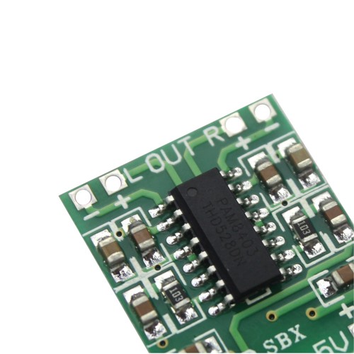 Üzerinde PAM8403 D sınıfı 3W (kanal başına) 2 kanal amplifikatör entegresine sahip modüldür. D sınıfı amplifikatöre sahip olduğundan verimi %90 seviyelerindedir. 5V gerilim ile çalışır. Kulaklık amfisi, mini hoparlör ve robotik projelerinde kullanılabilir.